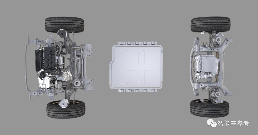 前轴部分,将混动专用发动机(1.5L或1.5T)和发电机、前轴驱动电机,以及DHT 2档变速器高度集成为一个模块。