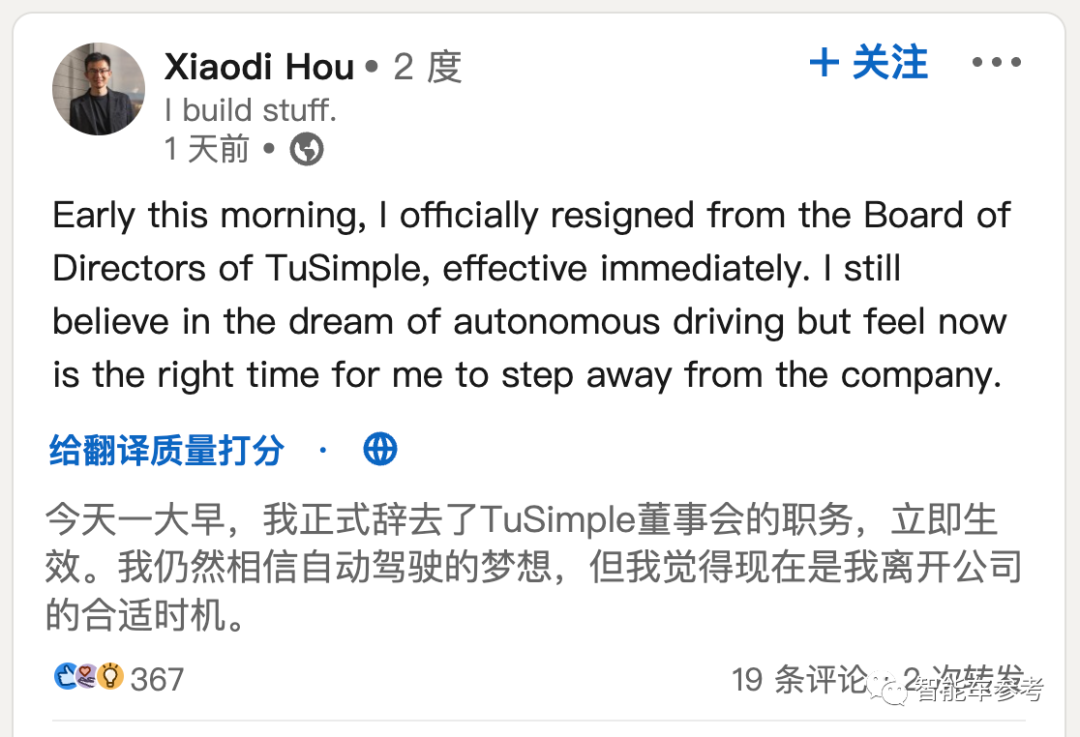 通过一则个人领英页面的最新动态,他表示已经辞任了图森董事会职务,即便依然心怀自动驾驶梦想,但此时已经到了合适的时候。