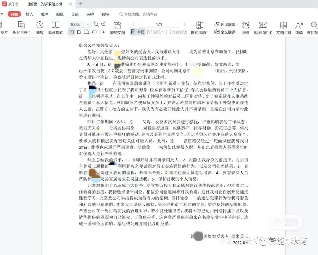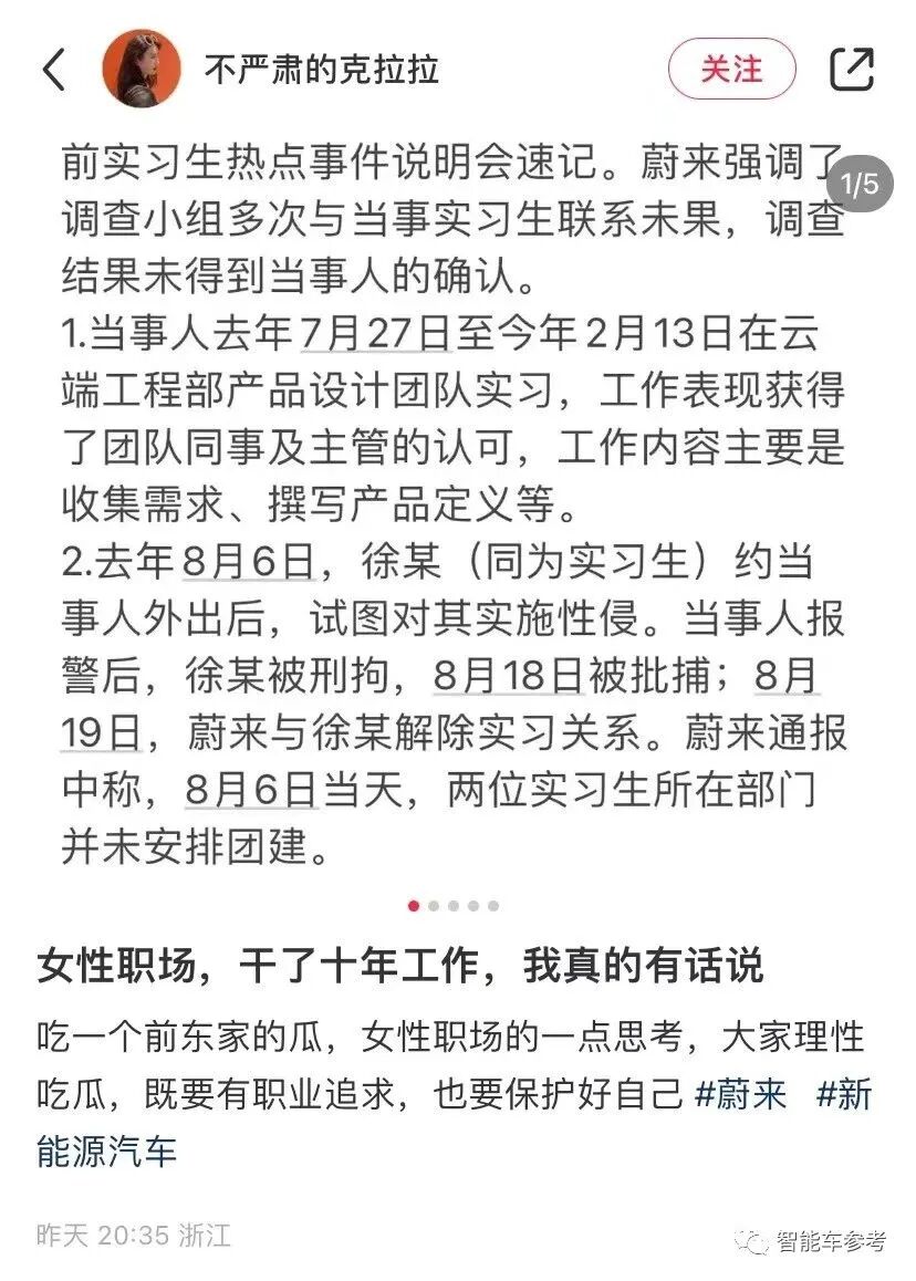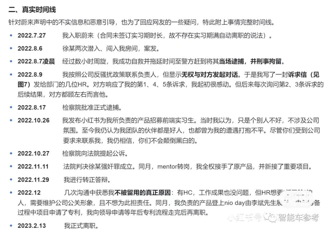 2、去年8月6日,徐某(同为实习生)约当事人外出后,试图对其实施性侵。当事人报警后,徐某被刑拘,8月18日被批捕;8月19日,蔚来与徐某解除实习关系。8月6日当天,两位实习生所在部门并未安排团建。