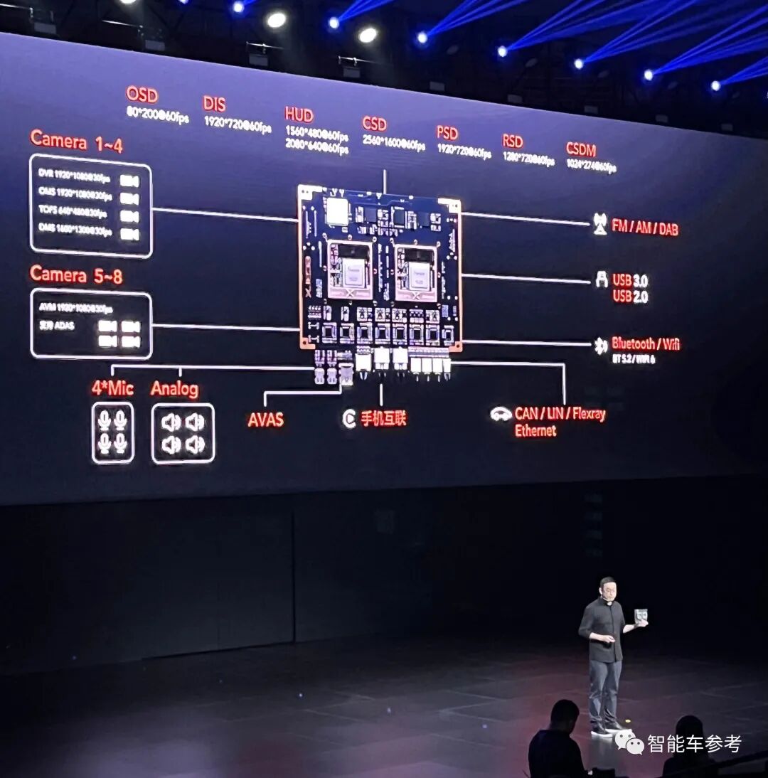 可接入4颗200万像素摄像头,支持HUD抬头显示、360环视系统、4K娱乐屏幕,可实现64/128/256GB大容量存储,提供LPDDR5/LPDDR4X内存,以及支持蓝牙、麦克风、WIFI等多个座舱系统功能。