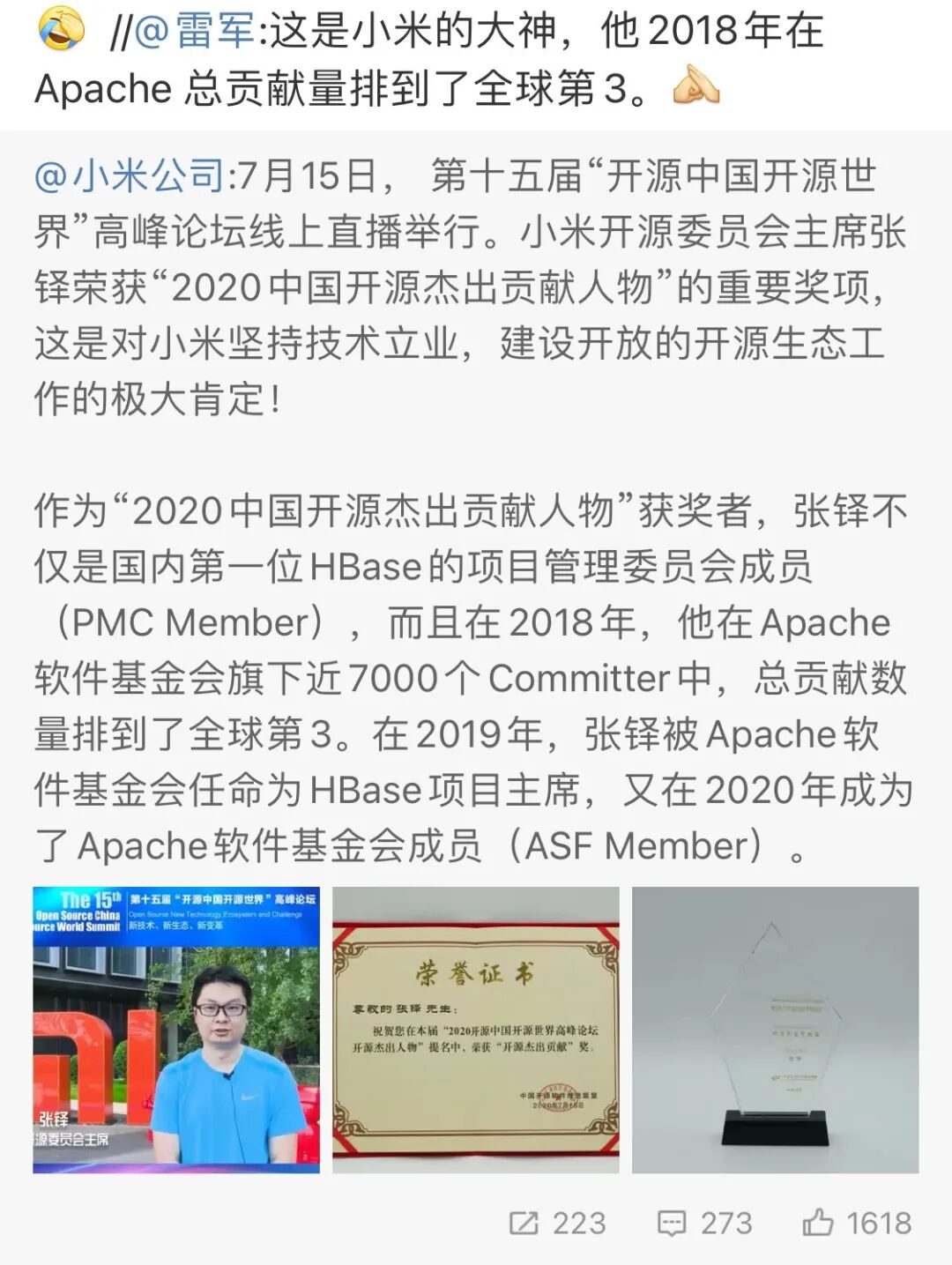 张铎还在2020年荣获了中国开源杰出人物,被作为小米技术立业的代表性人物和事件。