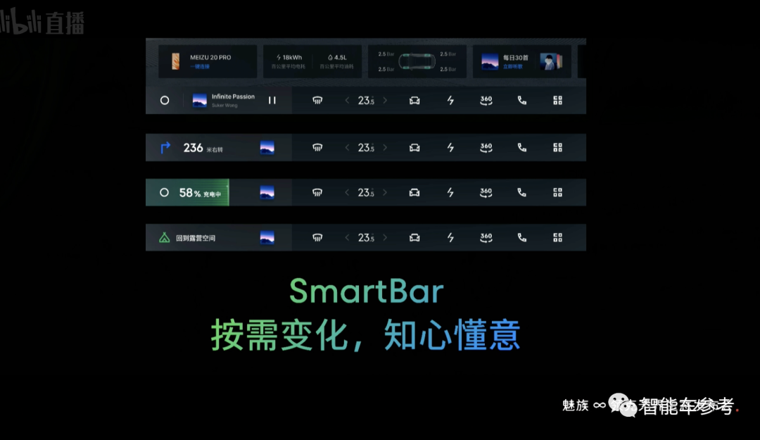 也有魅友熟悉的SmartBar功能,是Dock栏左下角的动态自适应交互区域,类似苹果的灵动岛,显示关键信息,包括音乐、充电电量、导航等。