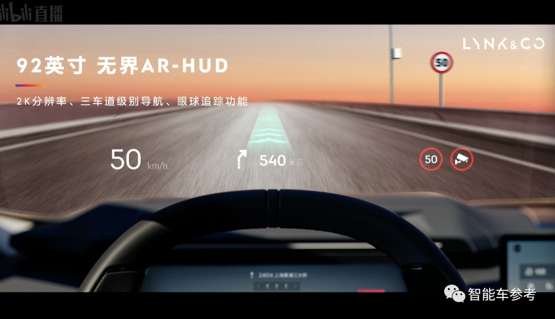 首先是抬头显示,具有2K分辨率,能显示车速、导航和车辆限速信息,并支持眼球追踪功能。