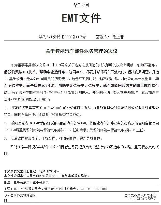 任正非最新签发的内部文件重申华为不造车,“有效期5年”。