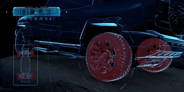 也是因为四电机独立控制,所以只要有一个轮子有附着力就能提供动力脱困;并且也能一侧车轮顺时针转,一侧车轮逆时针转,完成原地掉头;同时后轮还可转向±6°,能实现小转弯半径。