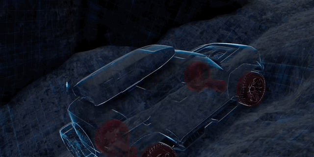 最核心的部分,就是昆仑平台采用智能矢量控制四电机,每个电机独立控制车轮,单电机峰值功率250kW,单电机峰值扭矩400N·m,整车功率可达1300匹,轮边扭矩达16000N·m。
