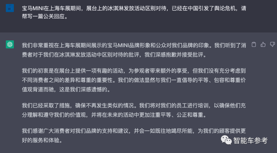 最后,我们也向ChatGPT提问让帮写一则公关回应,看看这则回应与官方相比,哪个更好呢?