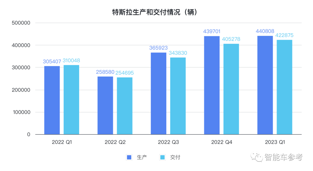 得益于一季度多次推出降价措施,以及接近最大产能的上海工厂,特斯拉一季度生产和交付均创下新高。共生产440808辆,交付422875辆,分别同比增长44.3%和36.4%。