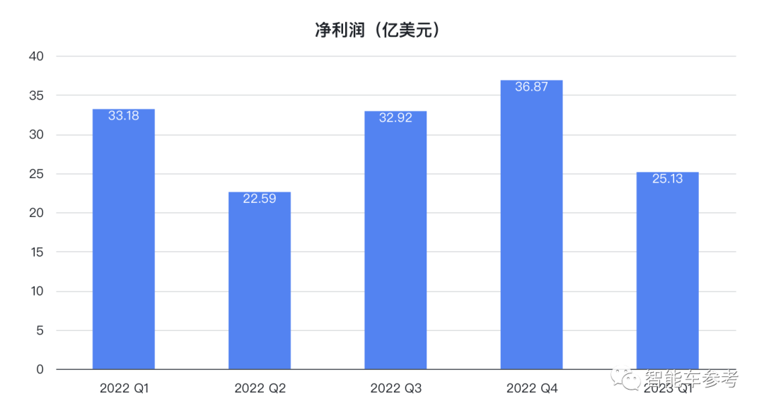 并且,汽车业务收入也在下降,为199.63亿美元,约合人民币1375.55亿,同比增长18%,环比下降6.3%。