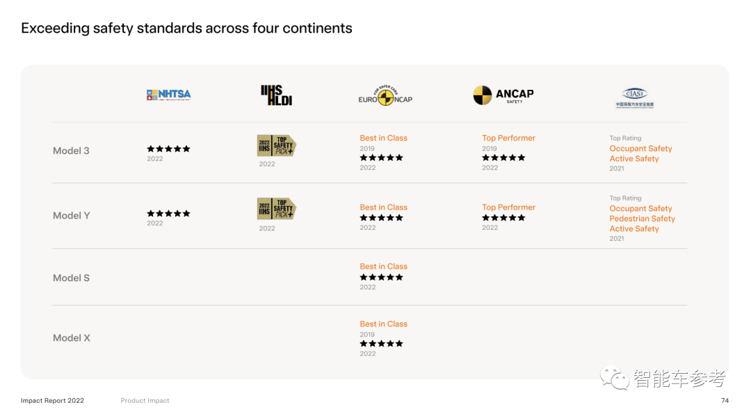 例如,拉出一堆权威机构的官方认证,这其中就包括5家:NHTSA(美国国家公路交管局)、IIHS(美国公路安全保险协会)、EURO NCAP(欧盟新车安全评鉴协会)、ANCAP(澳洲新车安全评鉴协会)、中国保险汽车安全指数。