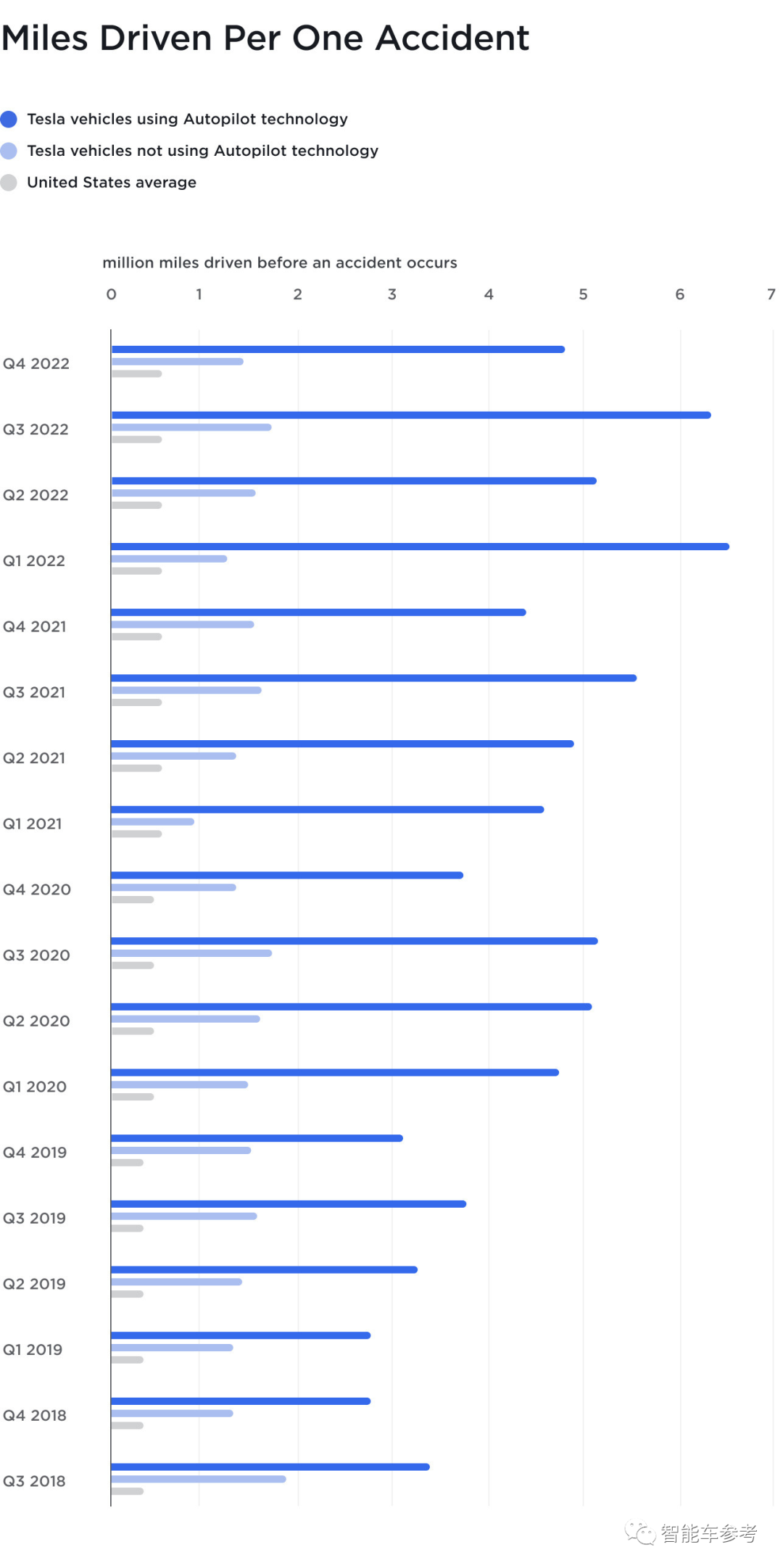 深蓝色主要反映特斯拉Autopilot能力,浅蓝色则代表未开启Autopilot的特斯拉车辆能力,最底下的灰色是全美平均水平。