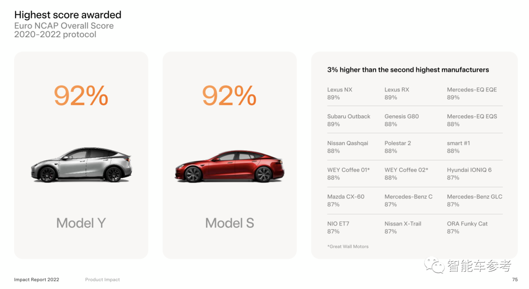 具体到欧盟新车安全评鉴协会给出的评分,2020-2022年期间,特斯拉Model Y评分为92%,Model S评分也为92%,“比第二名都高出3%”。
