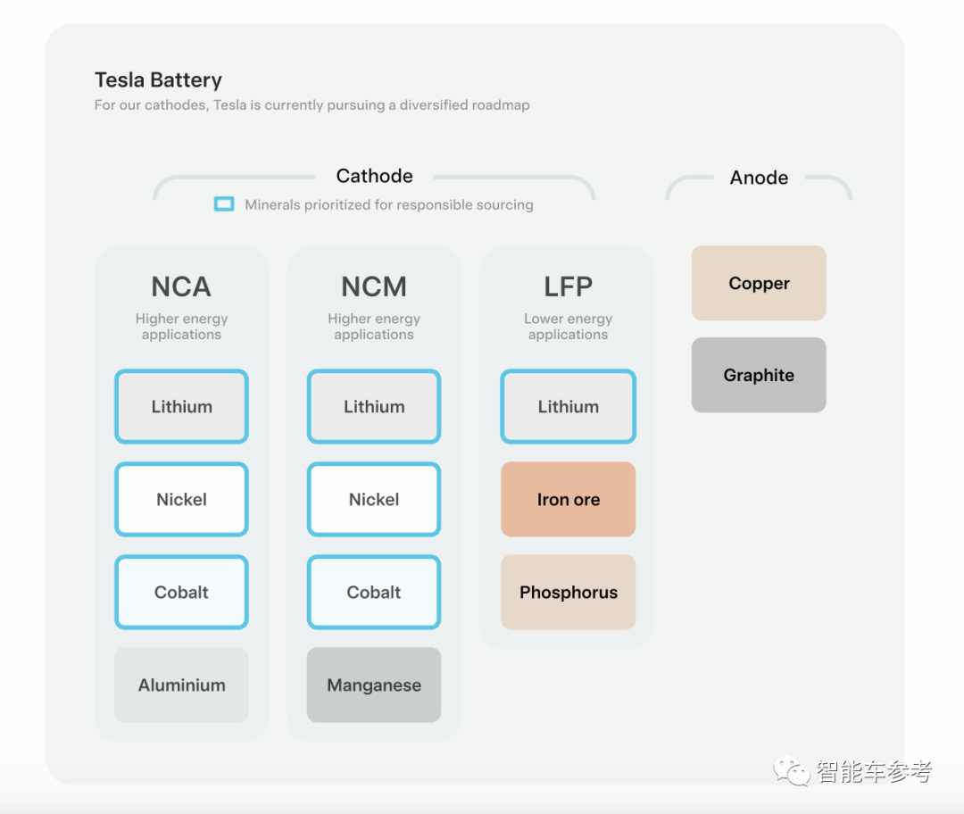 最后是在供应链方面,特斯拉一直在探求锂离子电池阴极成分的多样化: