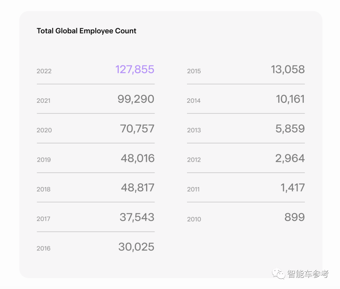 人文方面,去年一整年特斯拉一共收到了360万份求职简历。22年特斯拉全球员工数量首次突破10万大关,达到127855人,相比2021年增加了约2.9万人。