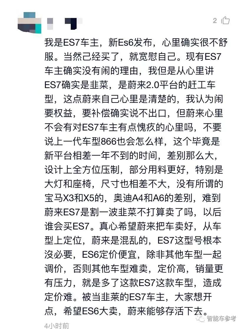 因为前不久,蔚来刚发布了新款ES6,价格比ES7便宜,平台配件更部分配置还比ES7高,所以一部分ES7车主表示不满。