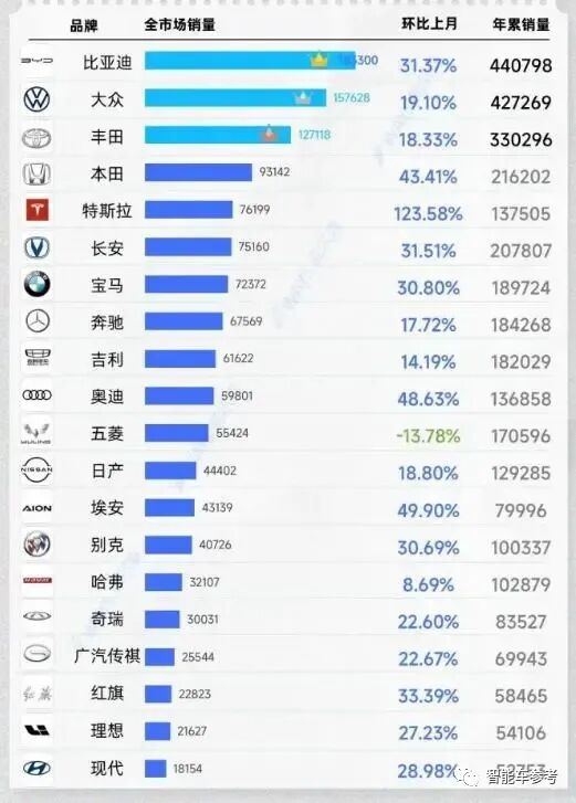 但比亚迪仍然保持在增长势头,和其他家相比,比亚迪新能源车型销量排在第一,甚至超过了特斯拉的全球销量。