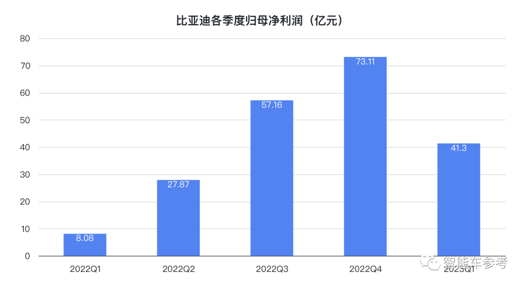 至于净利润,比亚迪Q1归母净利润为41.3亿,同比大增410.89%,但环比下跌43.51%。