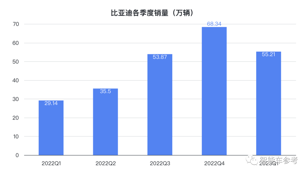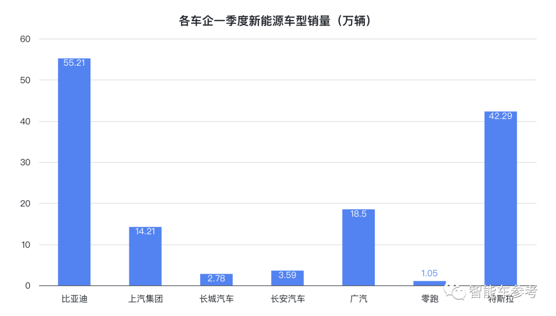 具体数字上,比亚迪一季度继续大卖55.2万辆,同比增长89.47%。