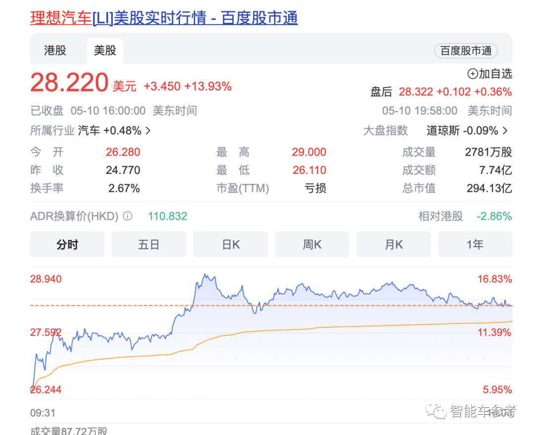随着财报的发布,市场也给予了积极反馈,理想美股股价猛涨13.93%,算下来市值一天涨了约35.9亿美元(折合人民币约为249亿元),理想总市值达到294.13亿美元,此时的市值远超蔚来和小鹏,接近特斯拉市值的5.5%。