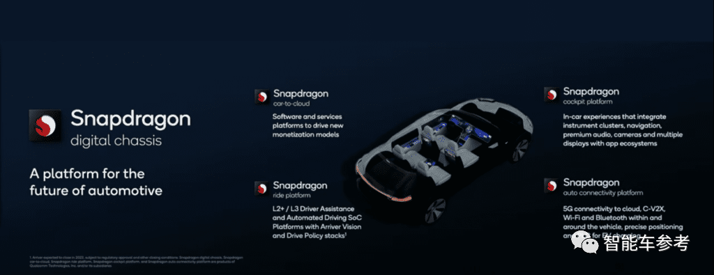 骁龙数字底盘是高通在2022年发布的一整套软件和硬件产品,包括骁龙Ride平台、座舱平台、汽车智联平台和车对云服务,涵盖智能驾驶、智能座舱、V2X以及车辆云服务,并建立安全连接。