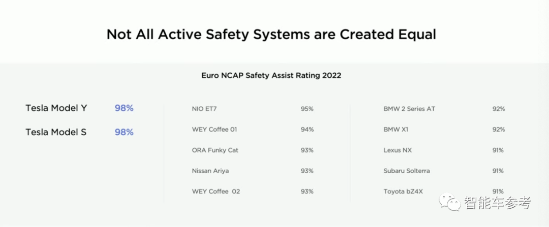 当然还列举了数据证明特斯拉是最安全的车(欧洲标准),对比了国产的蔚来ET7、长城魏和欧拉等车型: