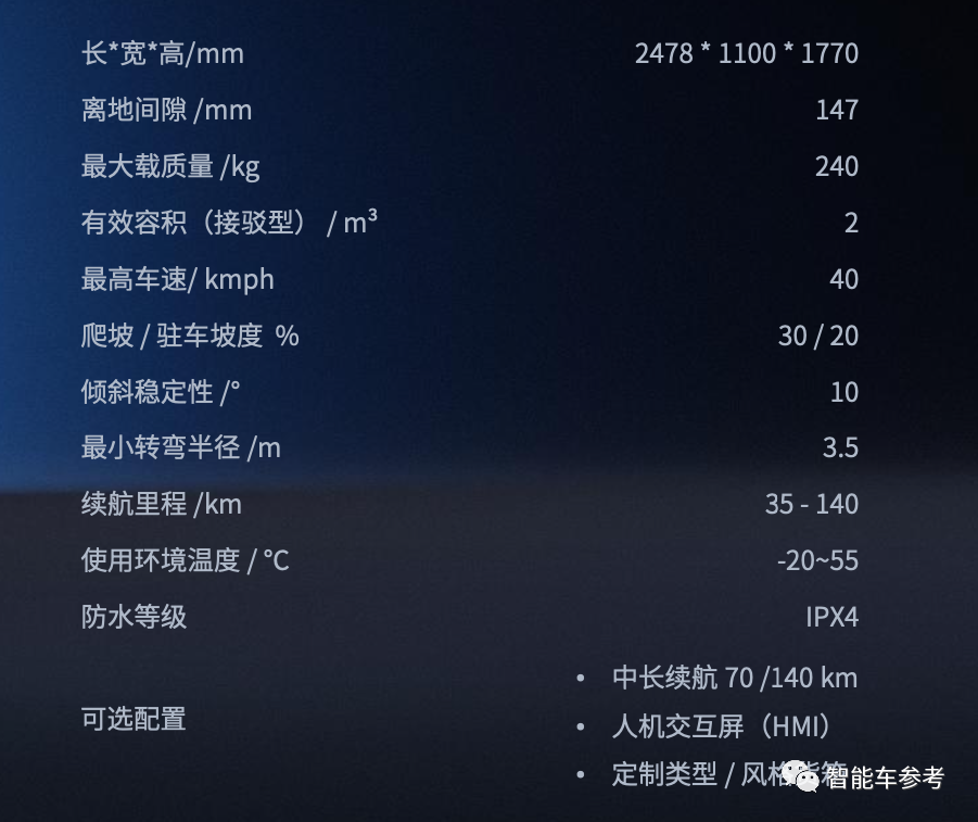车辆容积为2立方米,支持扩展到3立方米,最大载重240kg;续航也支持扩展,最高达140km。