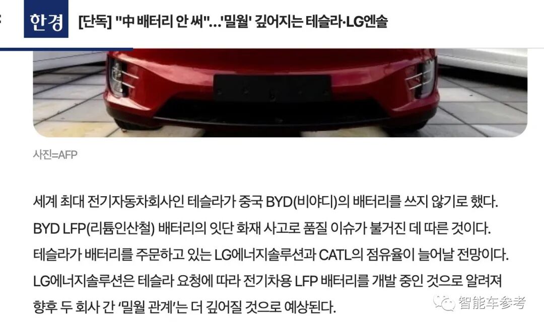 “分手”的消息是韩国媒体爆出的。据《韩国经济新闻》援引业内消息人士的话称,今年年初Model 3标准版等低价车型的电池供应合同到期后,特斯拉并未要求比亚迪追加供货。