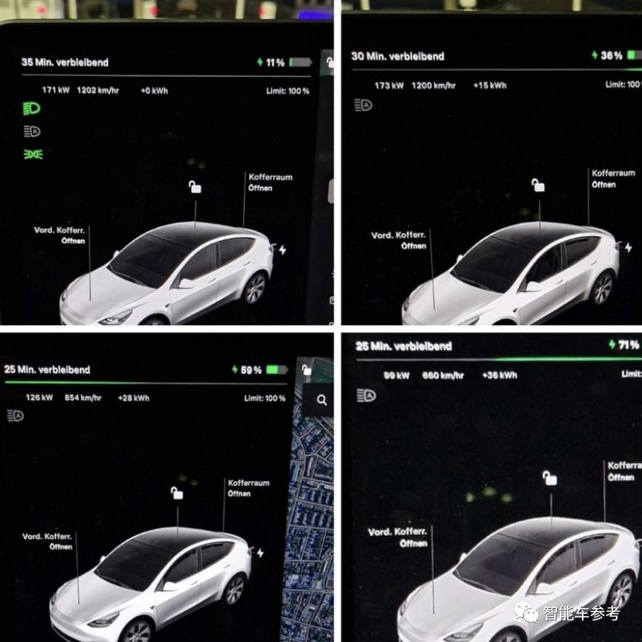 (图注:以四宫格左下为例,126kW代表此刻的充电功率,854km/hr代表此刻每小时能增加的续航,+28kWh代表一共充进了多少度电)