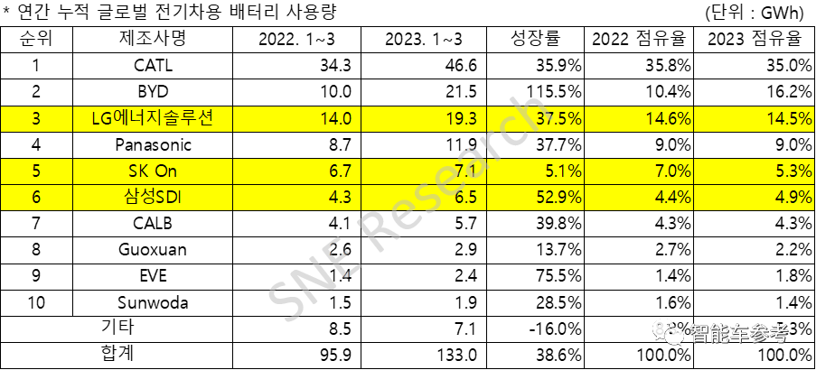 相比之下,比亚迪今年一季度动力电池装车量为21.5GWh,以16.2%的全球市占率名列第二。