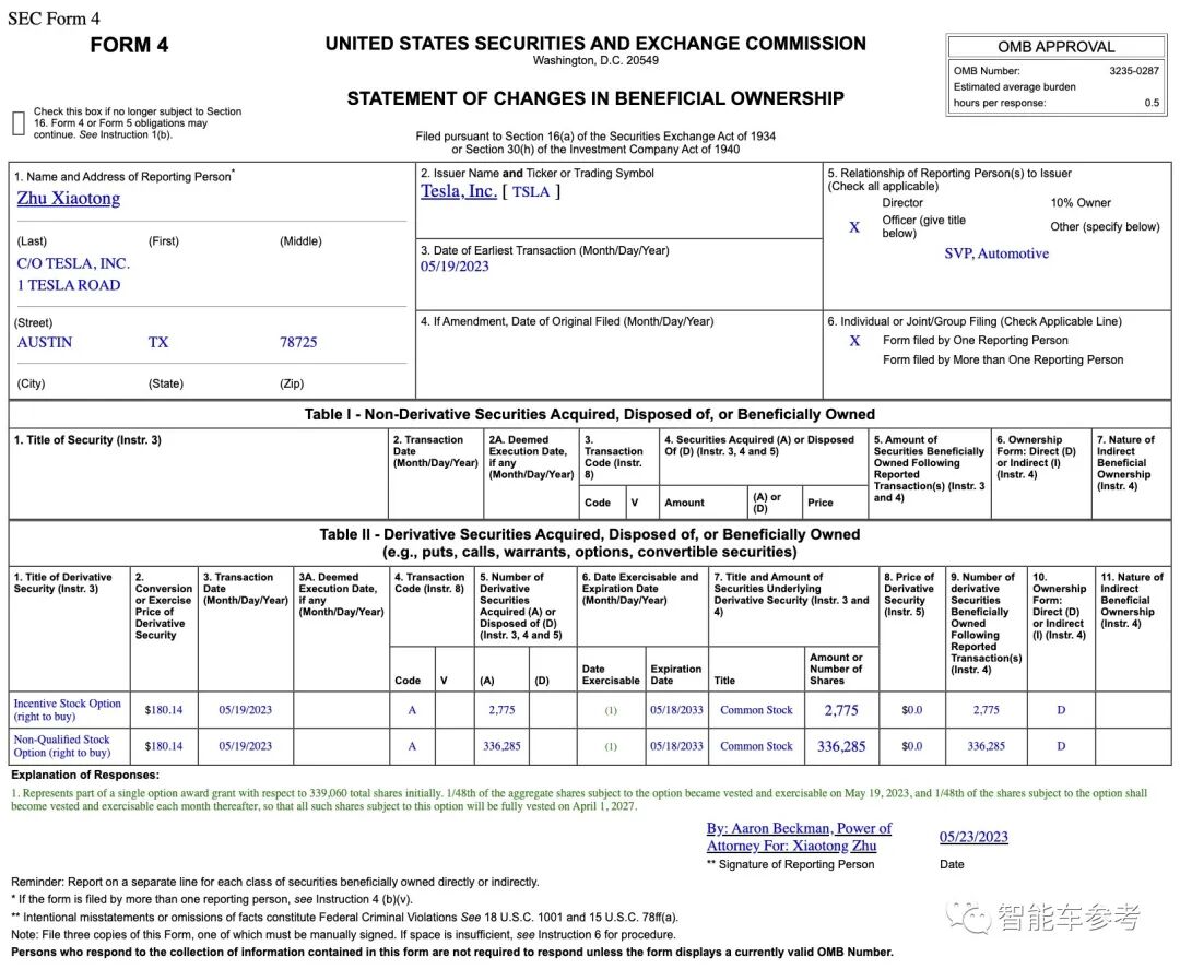 最近特斯拉向美国证券交易委员会提交了一份文件。文件中显示,朱晓彤最近获得一项股权激励计划,该交易已经在今年5月19日完成。