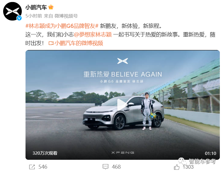 从林志颖预告自己完全康复准备复出开始,似乎就已经在为代言小鹏G6做准备了。