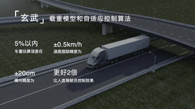 “玄武”则是在线载重测量算法,可以做到估算车重精度在5%以内。其主要作用在于实现更加精准的重卡车身纵横向控制。另外,通过在线载重测量算法,物流公司可以实时了解卡车的载重情况,并根据需要进行调整和优化,以确保不超载或欠载,提高运输效率和安全性,优化能耗,并避免因载重问题而导致的违规和罚款。