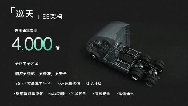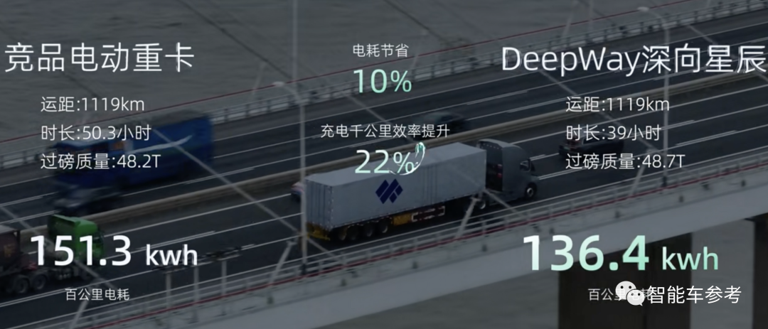 DeepWay智能新能源重卡与一般电动重卡比,电耗平均降低4-6%,对应的是“白虎”(官方名称)技术点。