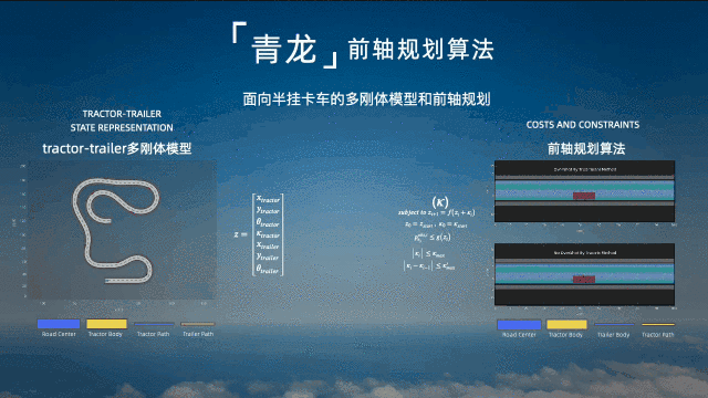其中“青龙”是前轴规划算法,卡车在运行中,面对曲率急剧变化且有多个障碍物侵入道路的复杂工况时,该算法可以通过优化转向角度和对车身姿态的及时调整,以确保卡车在各种路况下的平稳行驶,并提高操控性和驾驶舒适度,从而提高运输效率和安全性。