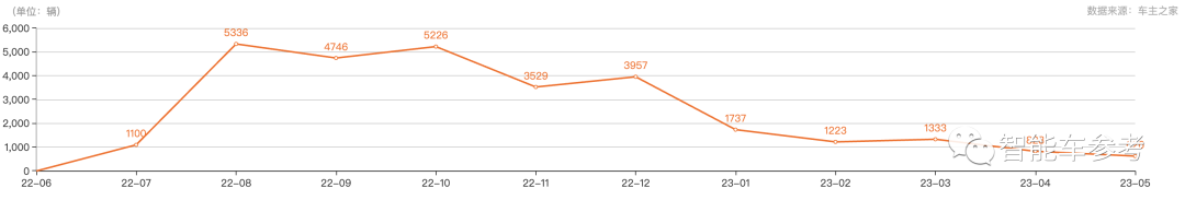 问界M7经历了短期的快速上升后,3000-5000左右的月销量维持了小半年就开始迅速下跌,如今月销只剩数百辆: