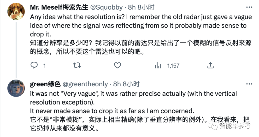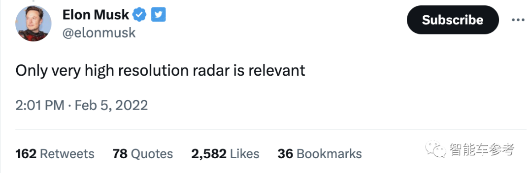 因为马斯克曾经说过,毫米波雷达也不是不行,高分辨率的其实可以胜过纯视觉方案。但可惜当时并没有这样满足马斯克需求的产品。