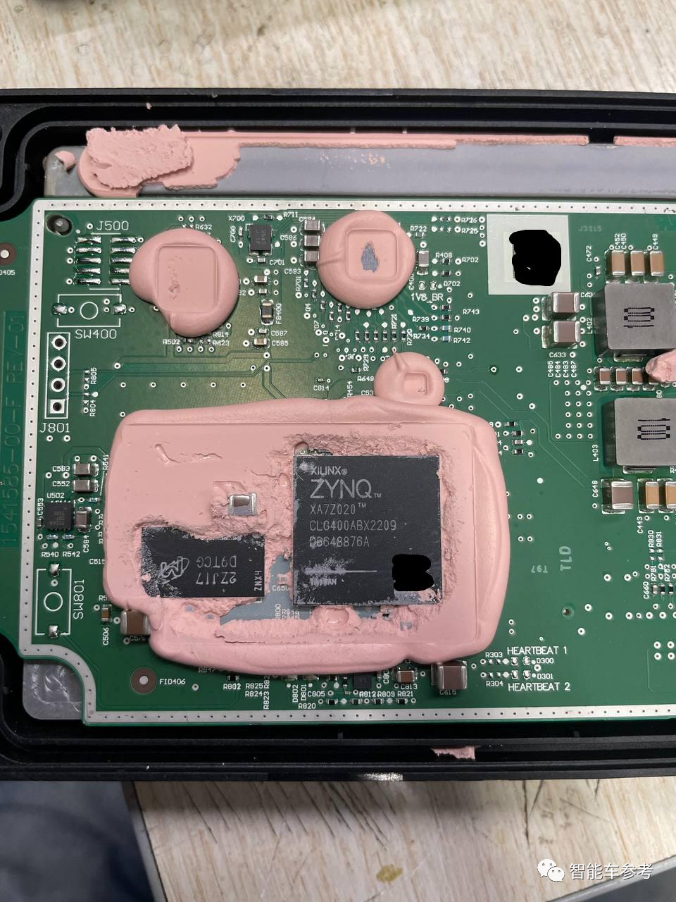 能够观察到毫米波雷达处理部分PCB用了AMD旗下Xilinx(赛灵思)的FPGA芯片,型号是XA7Z020,据说内含两个ARM A9核心、130级万门电路、53200个LUT,DSP算力276GMACs,价格大约在40-60美元(国内价格在900-1800元人民币之间)。