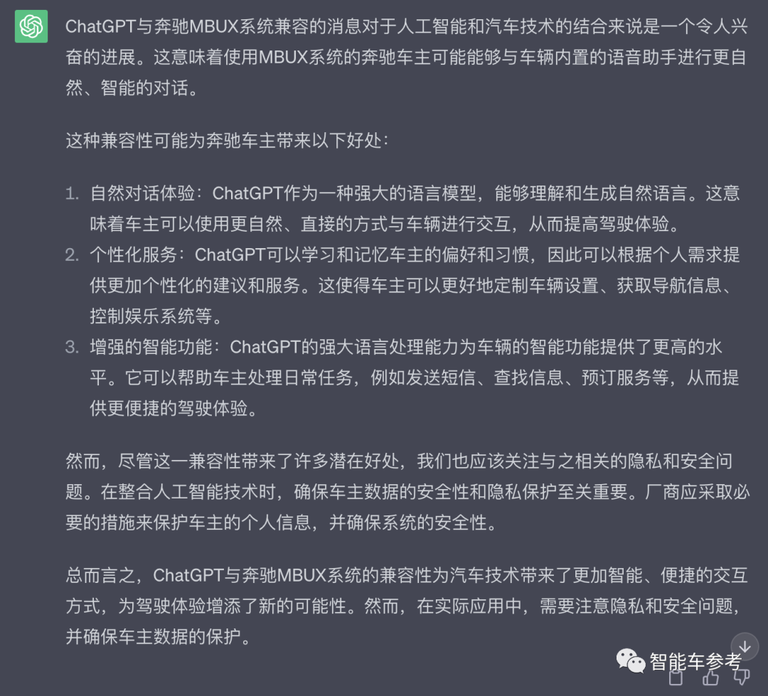 最后,我们也问了问ChatGPT怎么看待上车奔驰,它的回答是,“这是一个令人兴奋的进展,但也要注意隐私和安全性的问题”。