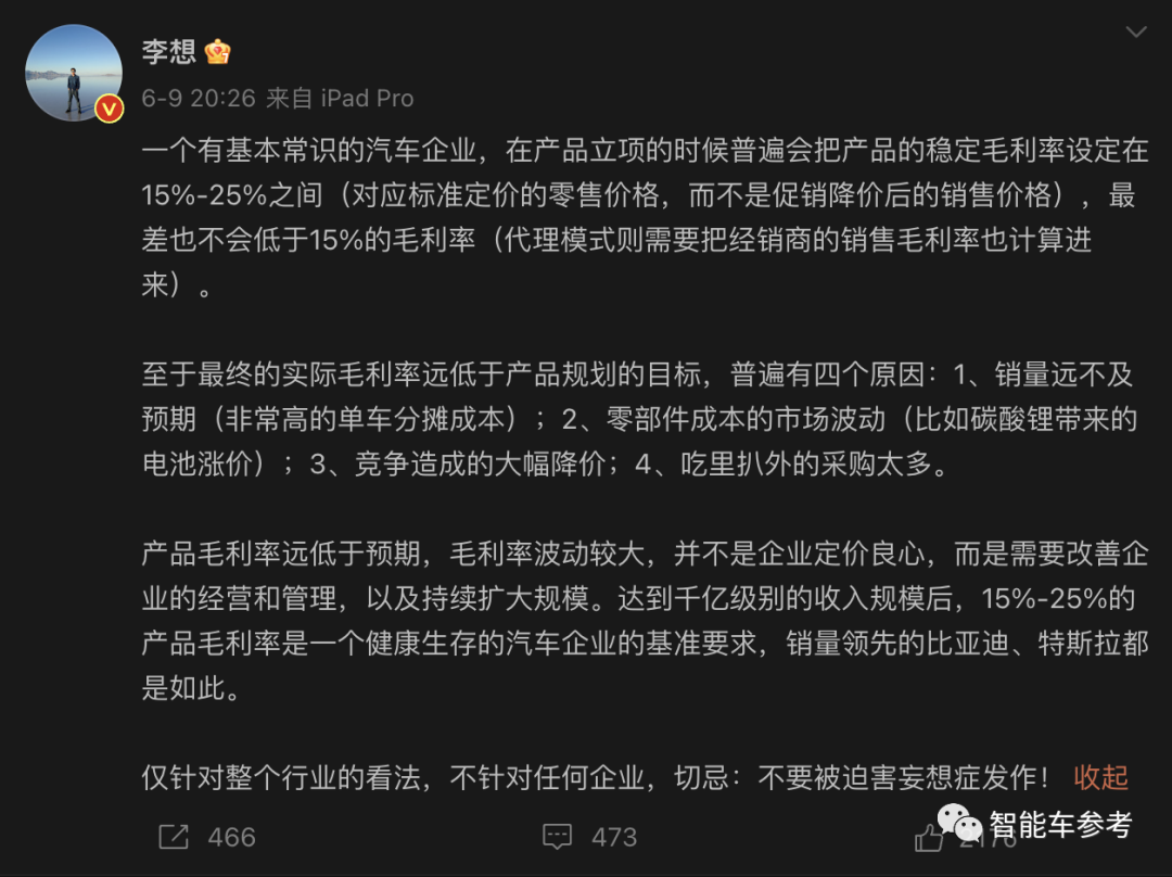 凑巧的是,李想在蔚来财报公布当天,也谈了对毛利率的看法。他认为,15%-25%的产品毛利率是一个健康生存的汽车企业的基准要求。