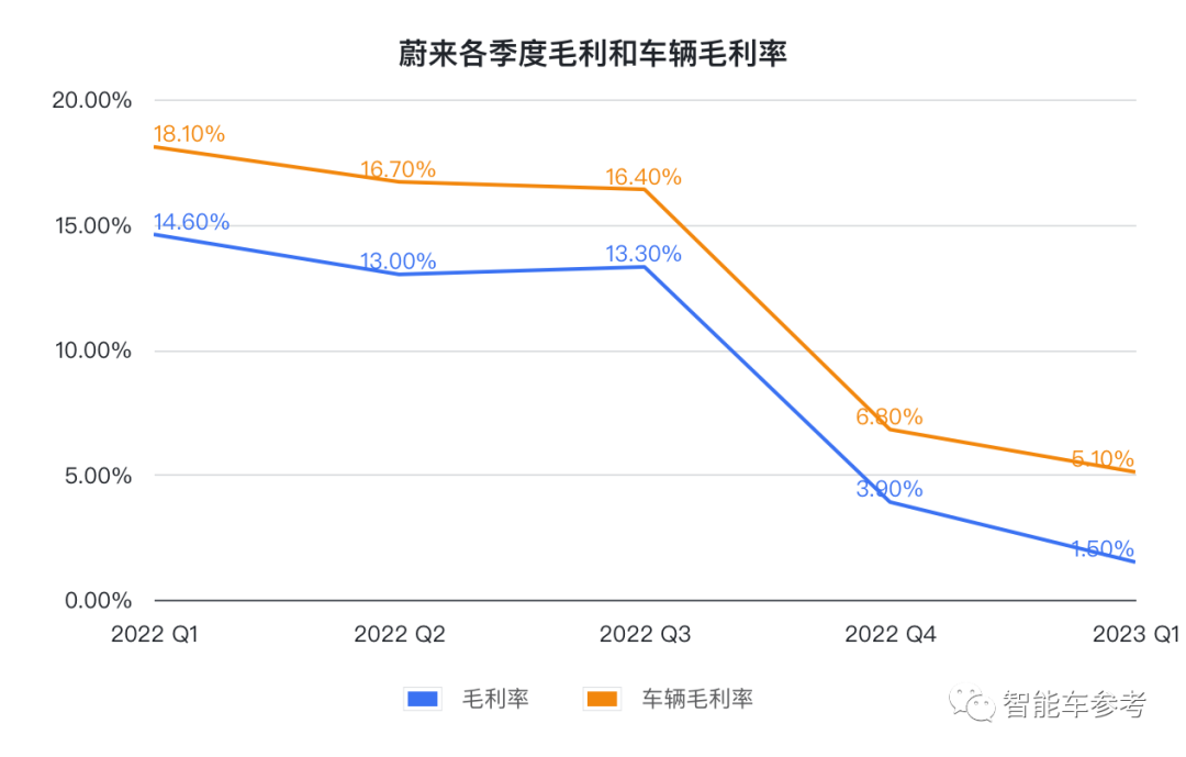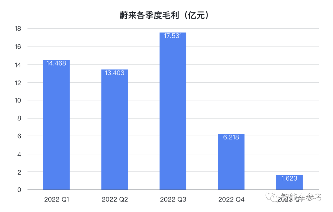蔚来一季度毛利仅为1.623亿元,同比下降88.8%,环比下降73.9%。