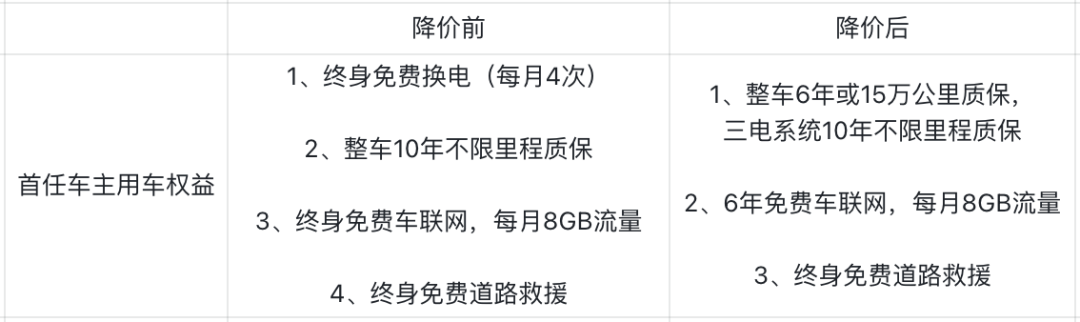 蔚来这次降价,主要就是把免费的换电权益改为付费,连带着车联网和整车质保的权益也有缩水。