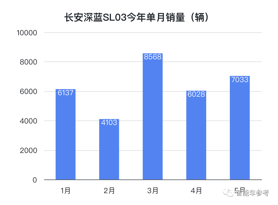 长安深蓝首款车SL03于去年7月正式上市,售价目前显示为17.99-69.99万元,且有着不错的销量成绩——据乘联会零售数据显示,2023年1-5月,深蓝SL03累计销量为31869辆,其中1-5月销量分别为6137辆、4103辆、8568辆、6028辆、7033辆。