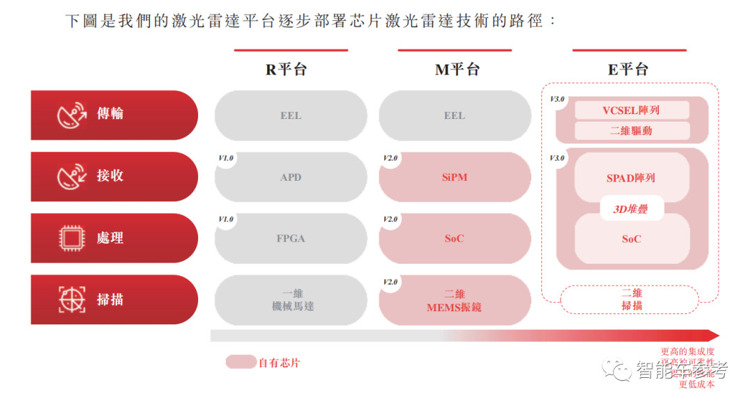 在初期阶段,速腾采用分立器件,推出了R平台;后来为了进一步减少成本与提高质量,速腾专注于自主研发芯片,从而开发了M平台与E平台。