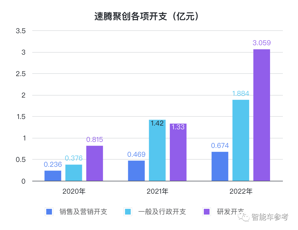 在所有开支中,速腾聚创的研发支出相对占大头,2020-2022年分别产生研发开支:8153.4万元、1.33亿元、3.059亿元,分别占各期间总收入的47.7%、40.2%及57.7%。