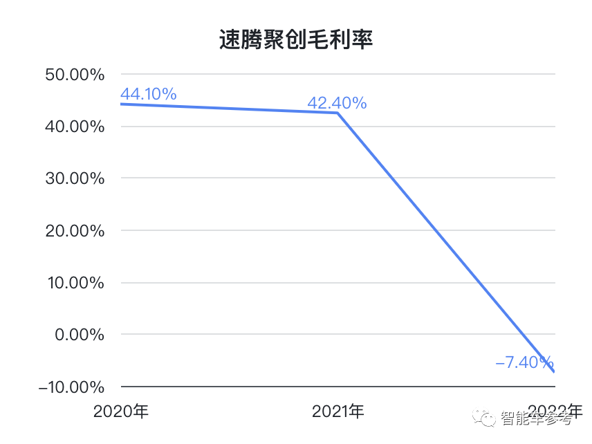 与之对应,毛利率同样表现为一开始为正,后面转为负:2020-2022年公司毛利率分别为44.1%、42.4%、-7.4%。