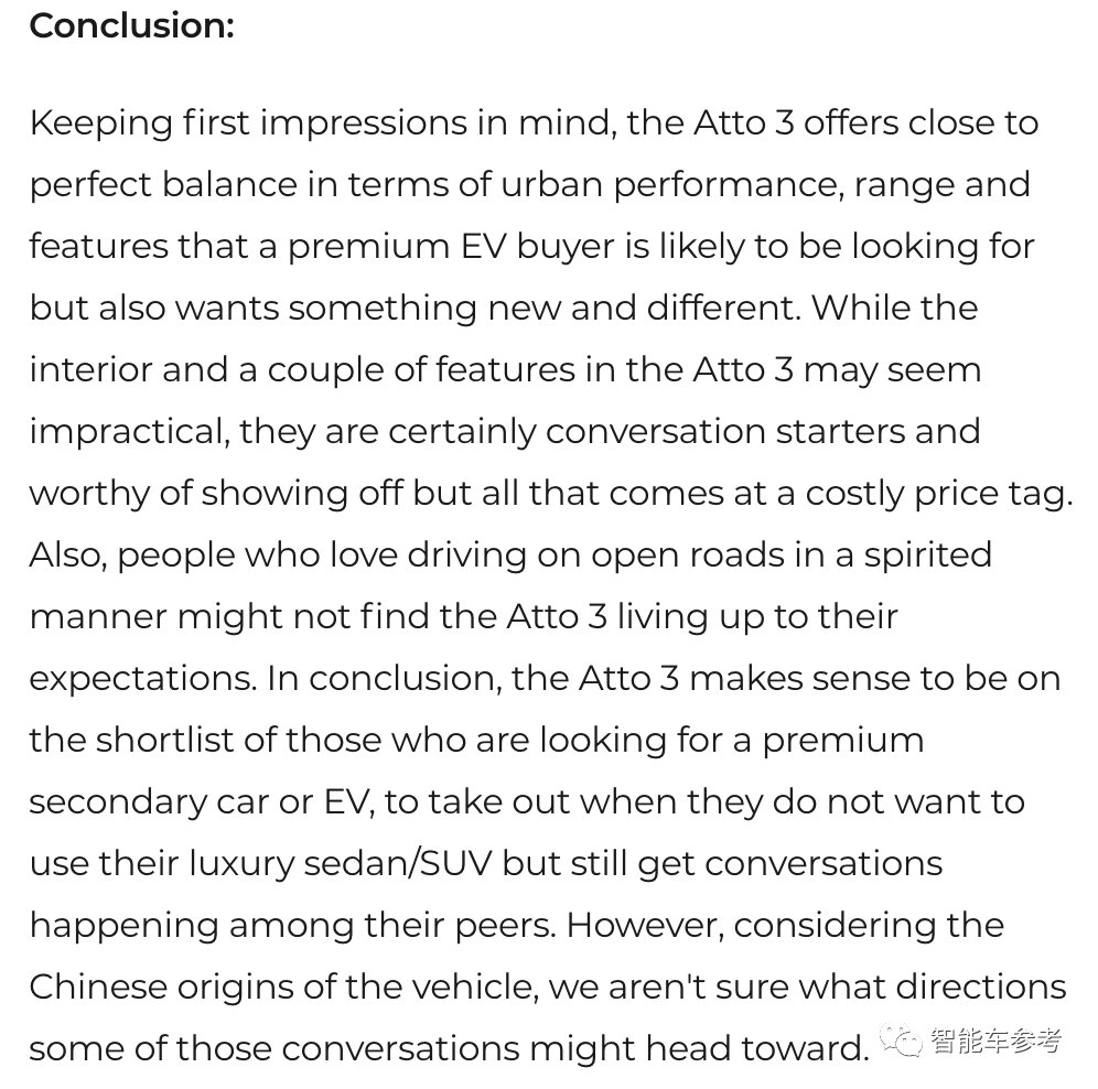 一英国媒体在试驾后,认为比亚迪ATTO 3很精致、内饰做工很好,续航可以。并且作为一款家用电动车,比亚迪ATTO 3更注重舒适性也很不错,还有充足的乘客空间,就是后备箱空间有些不足。