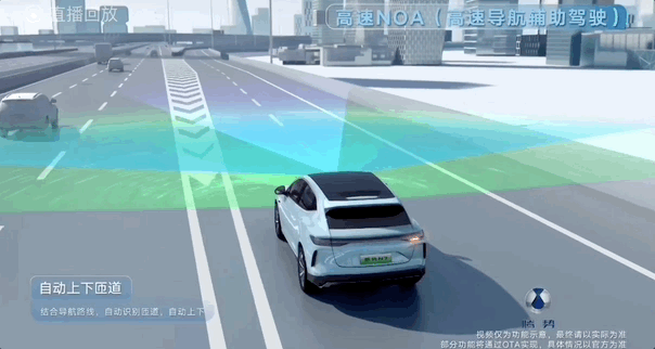 比如高速NOA功能下,除了常规的车道保持、定速巡航、主动刹车之外,还能根据导航信息自主上下匝道: