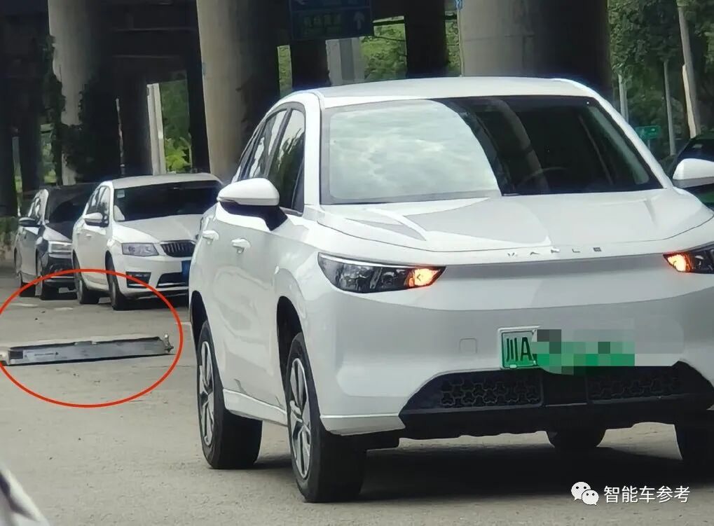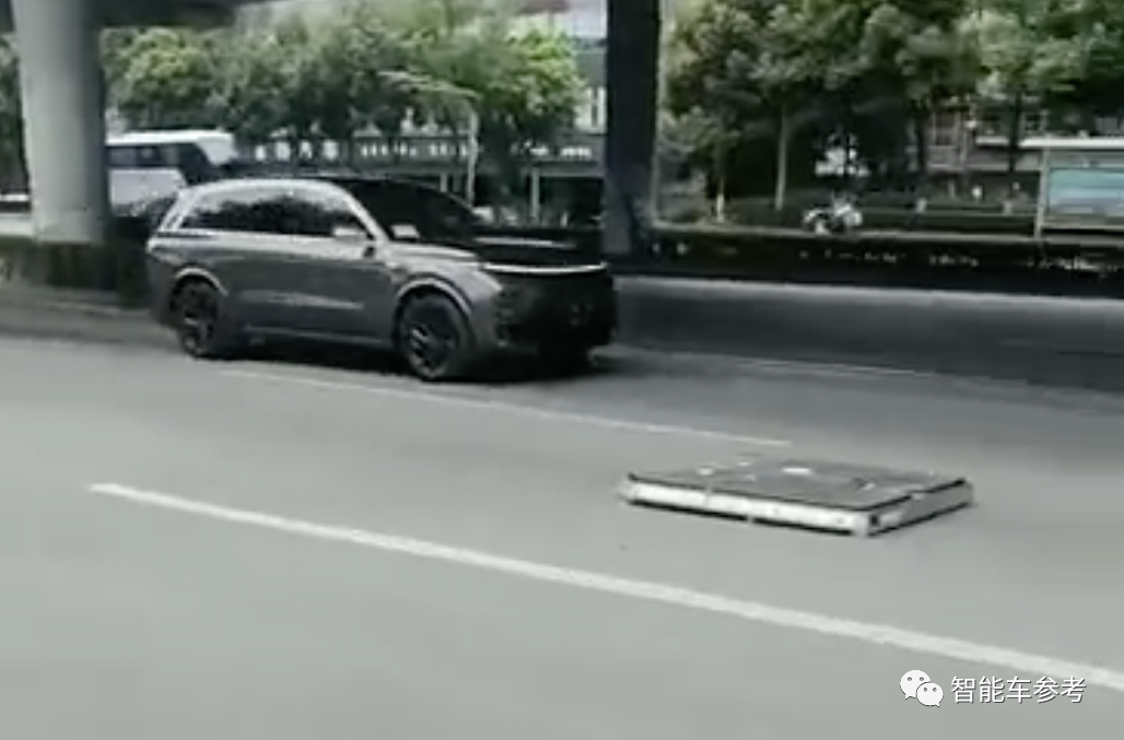 这辆新能源在开的时候电池包突然从车底脱落,车辆因为惯性,停在了离电池不远的地方。