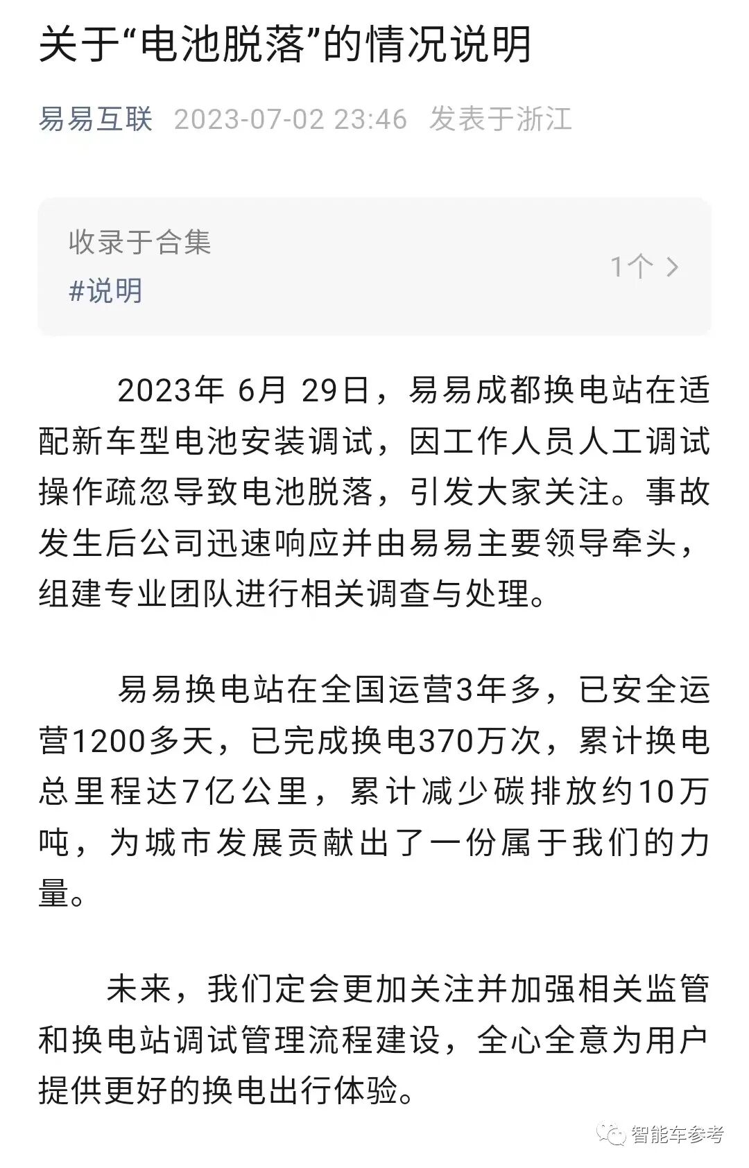 后来,一家名为易易互联的公司在公众号发表说明,表示当时成都换电站为了适配新车型,在进行新车型的电池安装调试。