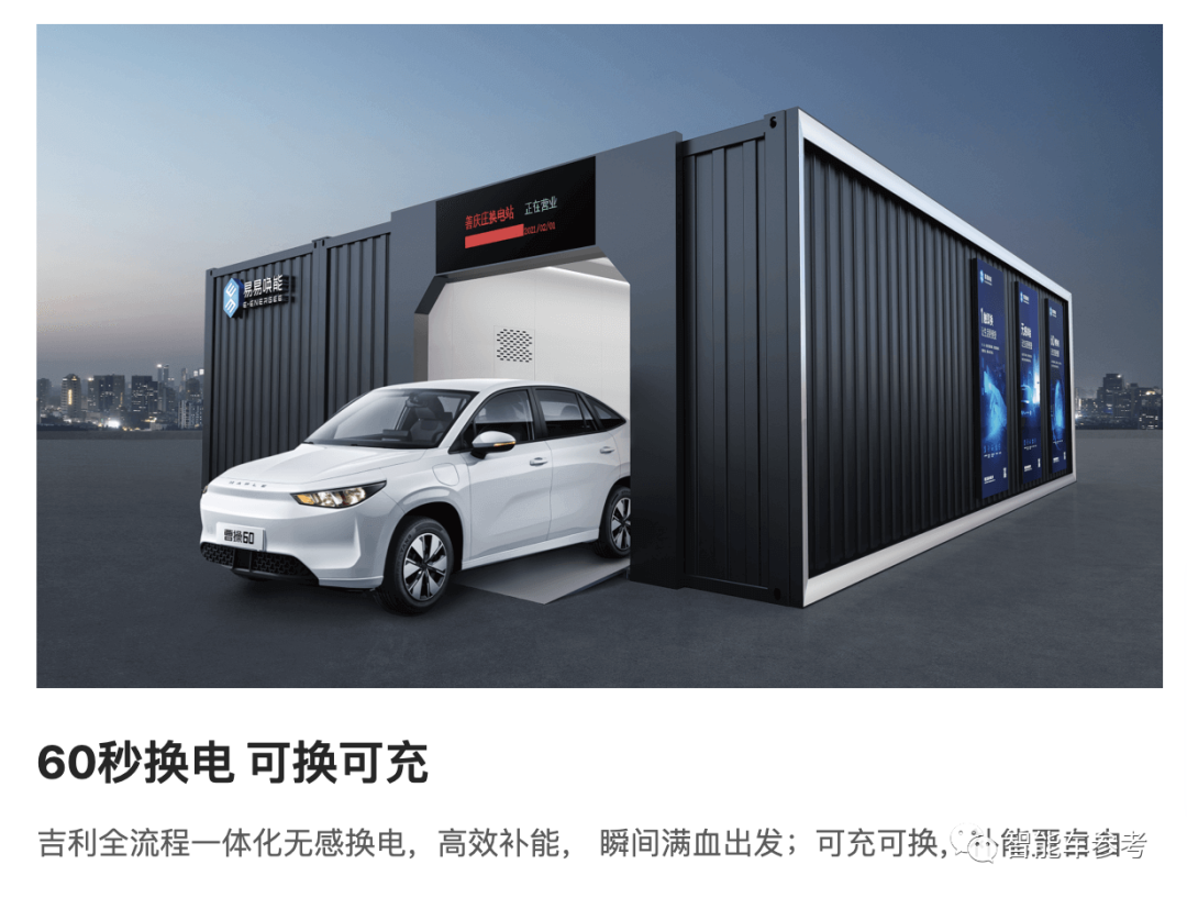官方介绍称,吉利全流程一体化无感换电只需要60秒,“高效补能,瞬间满血出发”。